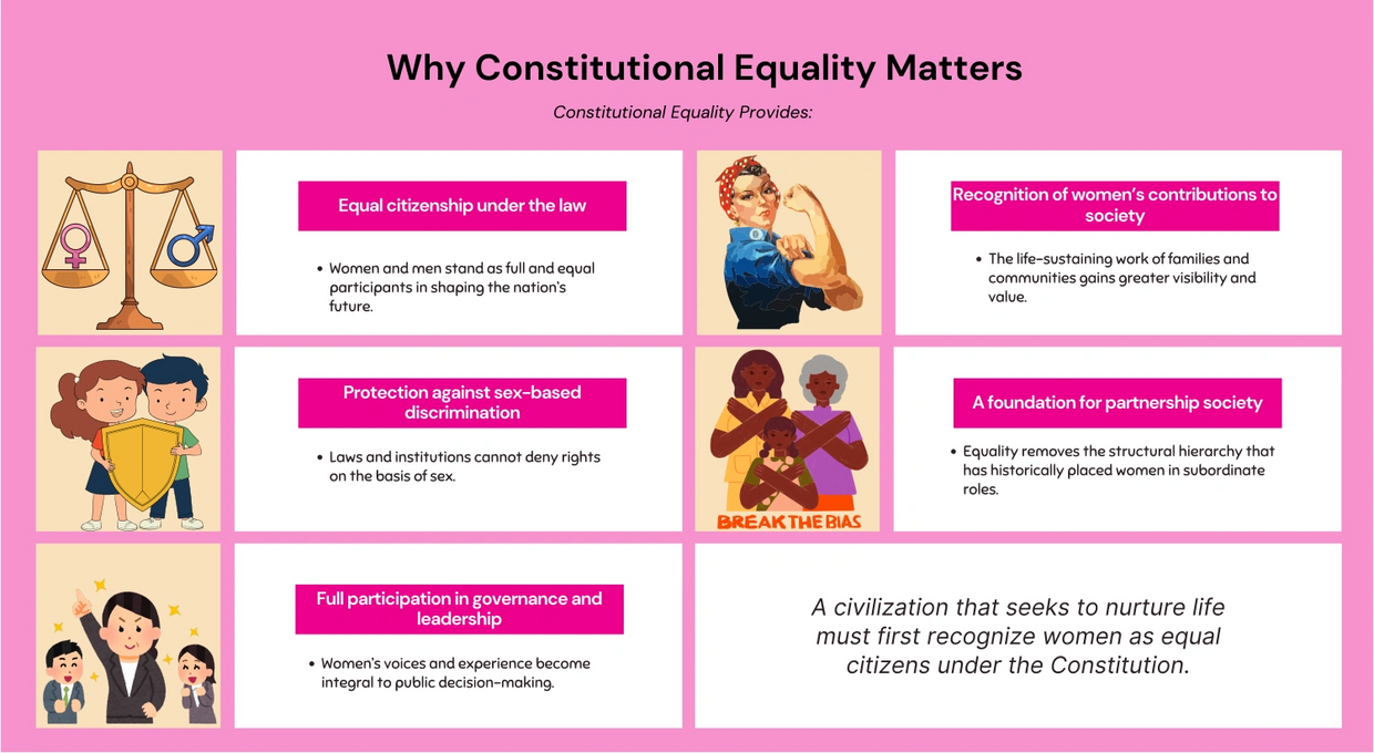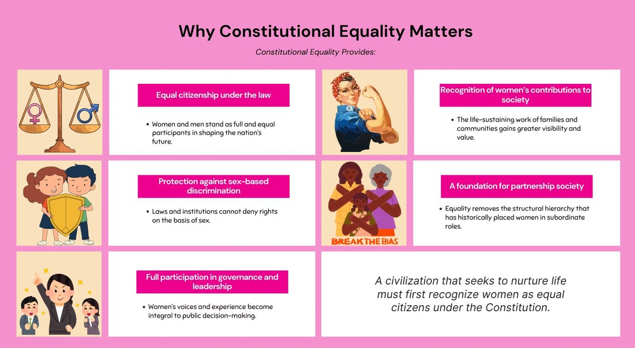 Equality under the Constitution therefore represents more than legal fairness. It is a step toward aligning our political structure with the deeper values of partnership, dignity, and the nurturing of life.